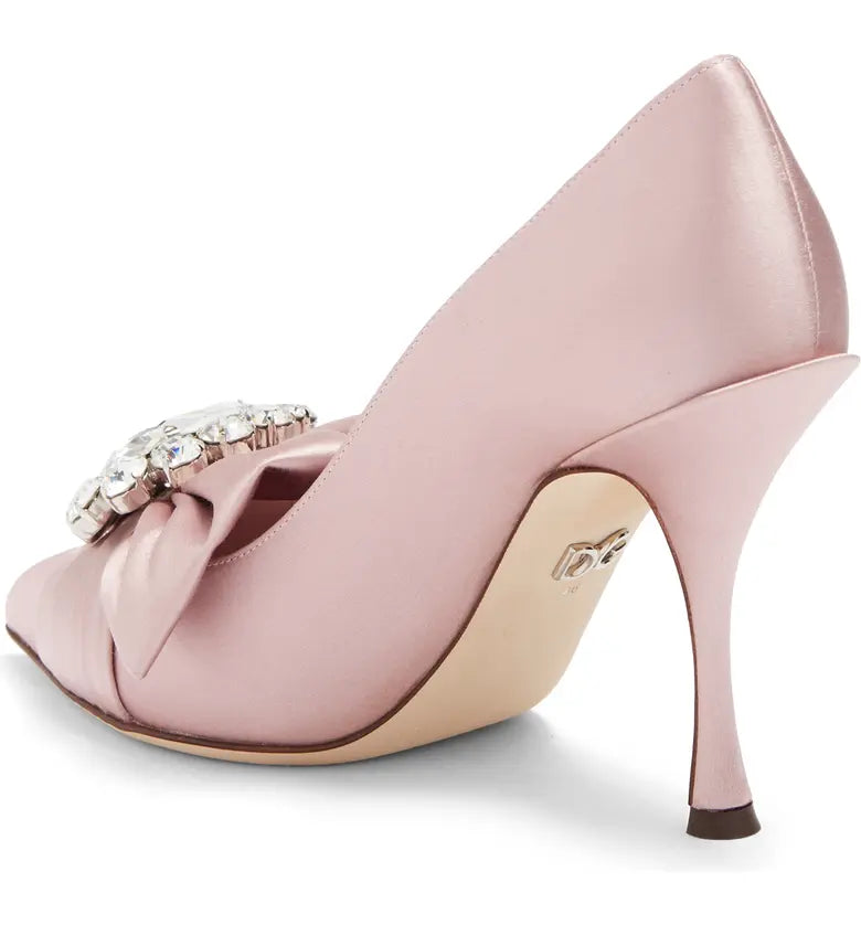 A crystal brooch adds sparkle to a satiny bow that adorns these pleat front pumps.