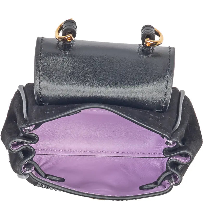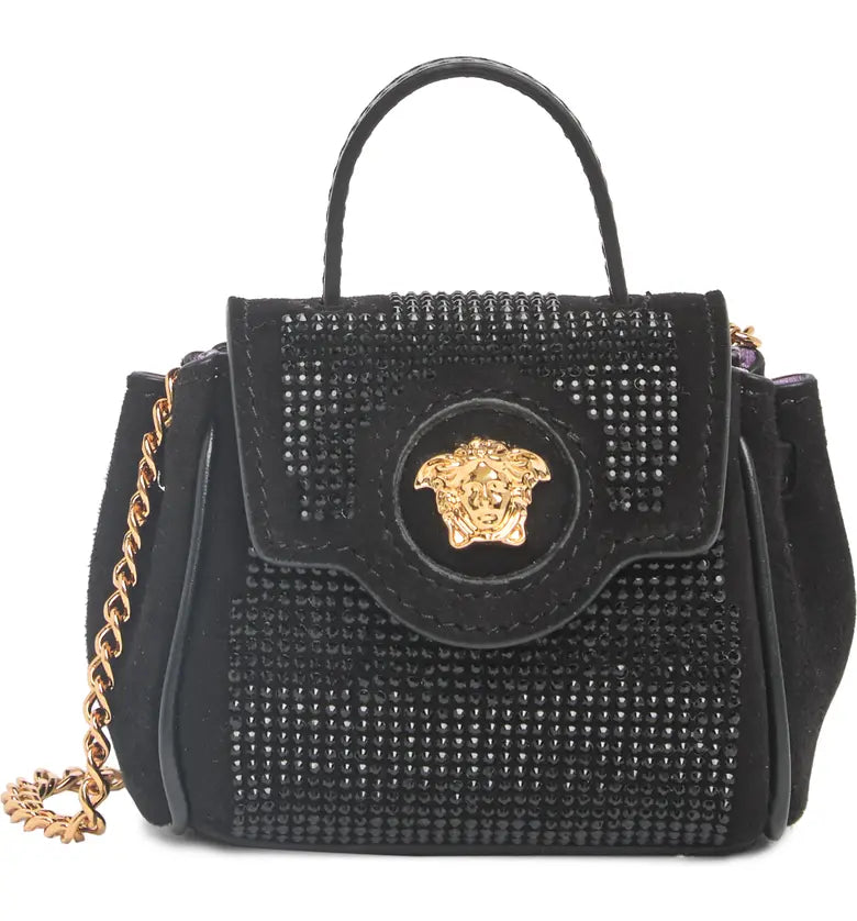 Tiny crystals decorate a leather minibag for you to stow away all of your daily essentials with.
