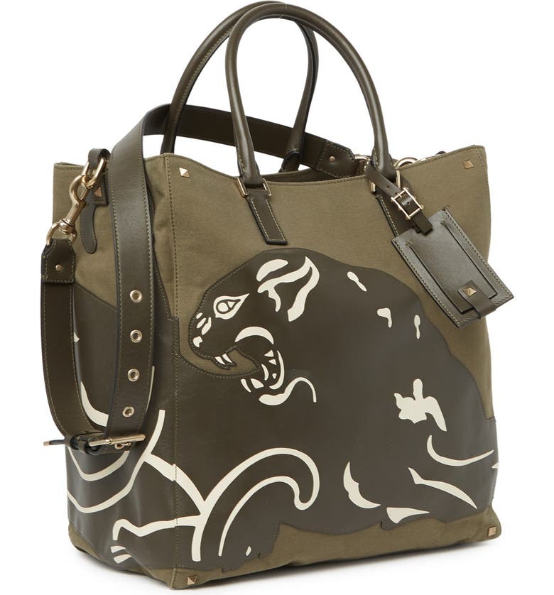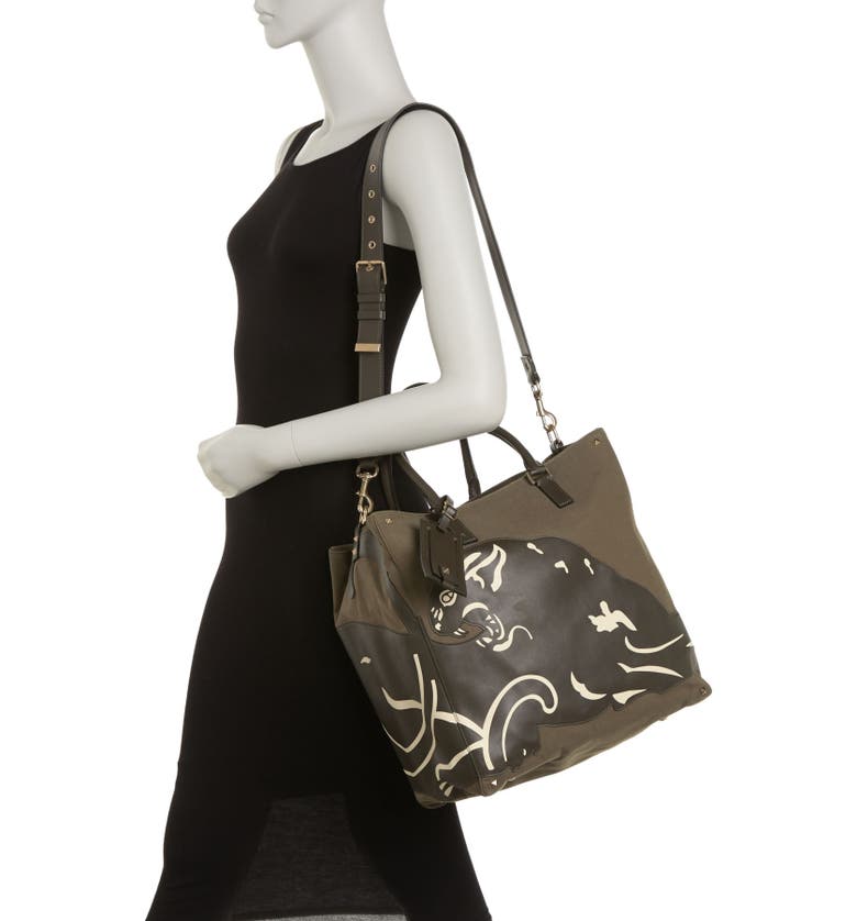 A signature panther print styles a leather tote with an adjustable shoulder strap for versatile carrying options.