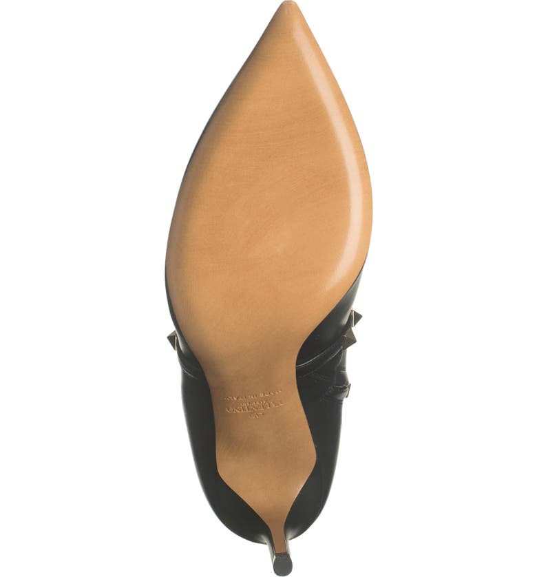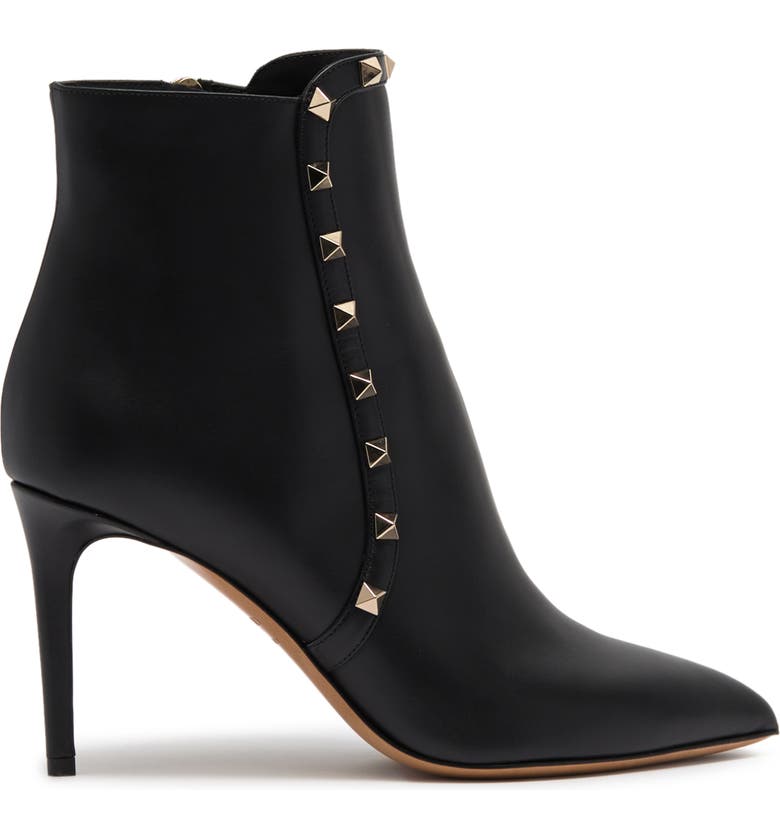 Pyramid studs gleam on a pointed toe stiletto bootie for chic, signature style.