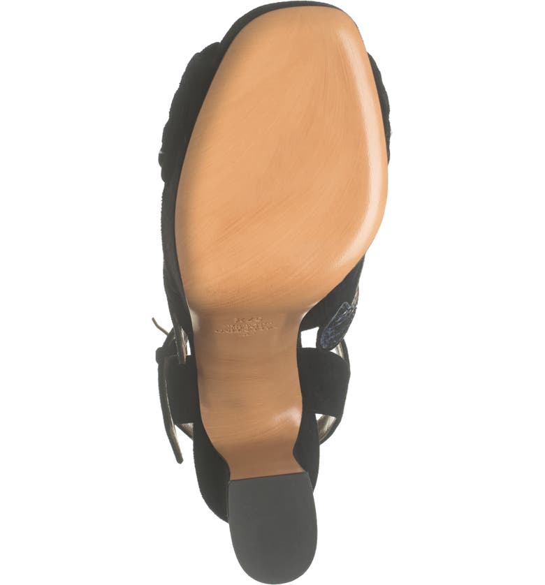 A vibrant butterfly accented with genuine snakeskin unfurls its wings across the vamp of a standout sandal lofted by a chunky platform and block heel.